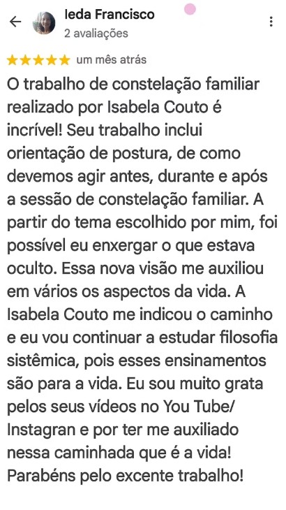 Sou a Isabela Couto Machado. Estudei Psicanálise e Psicologia, sou Cientista Religiosa e me considero uma divulgadora dos princípios sistêmicos, da filosofia de Bert Hellinger.